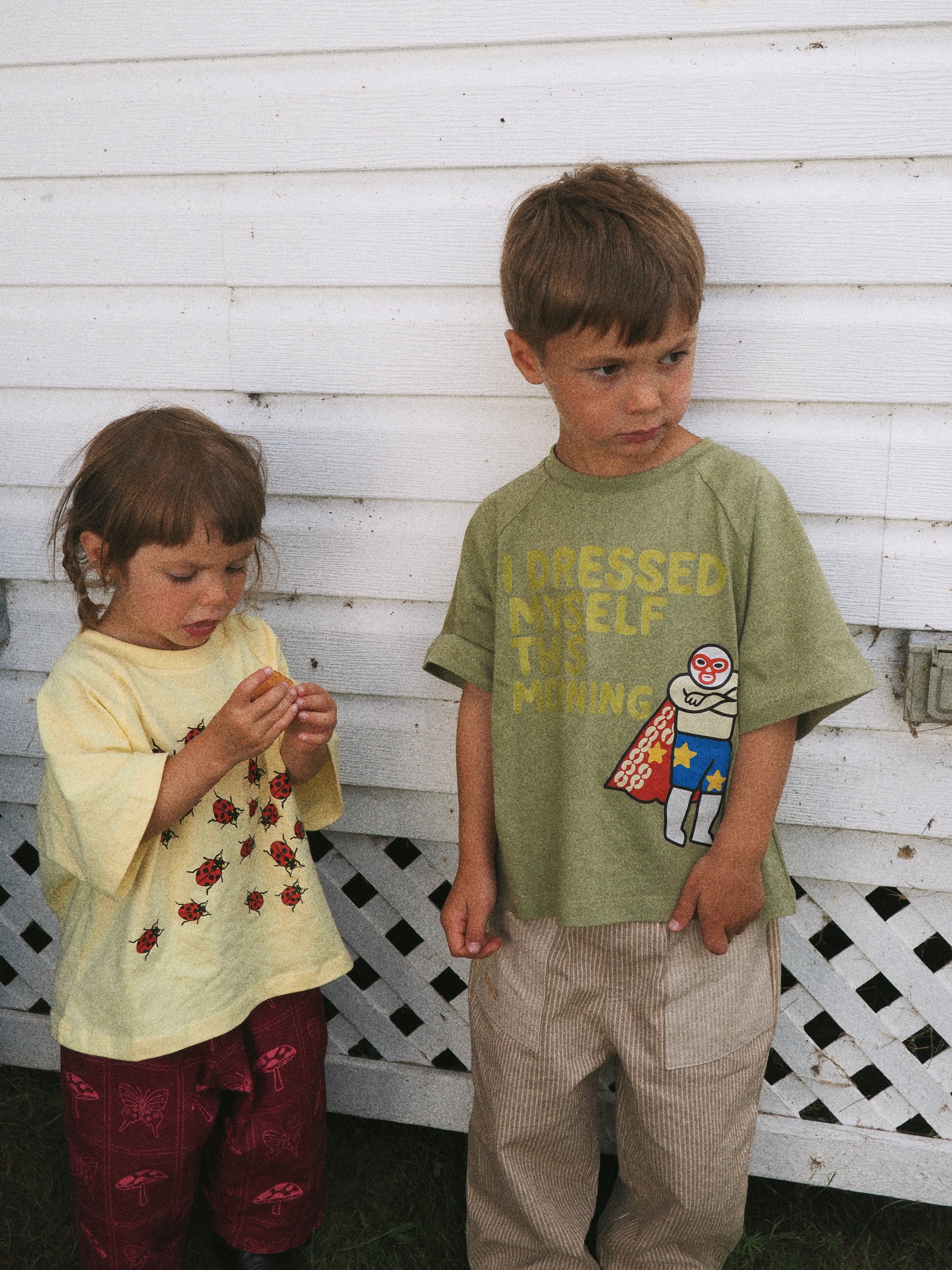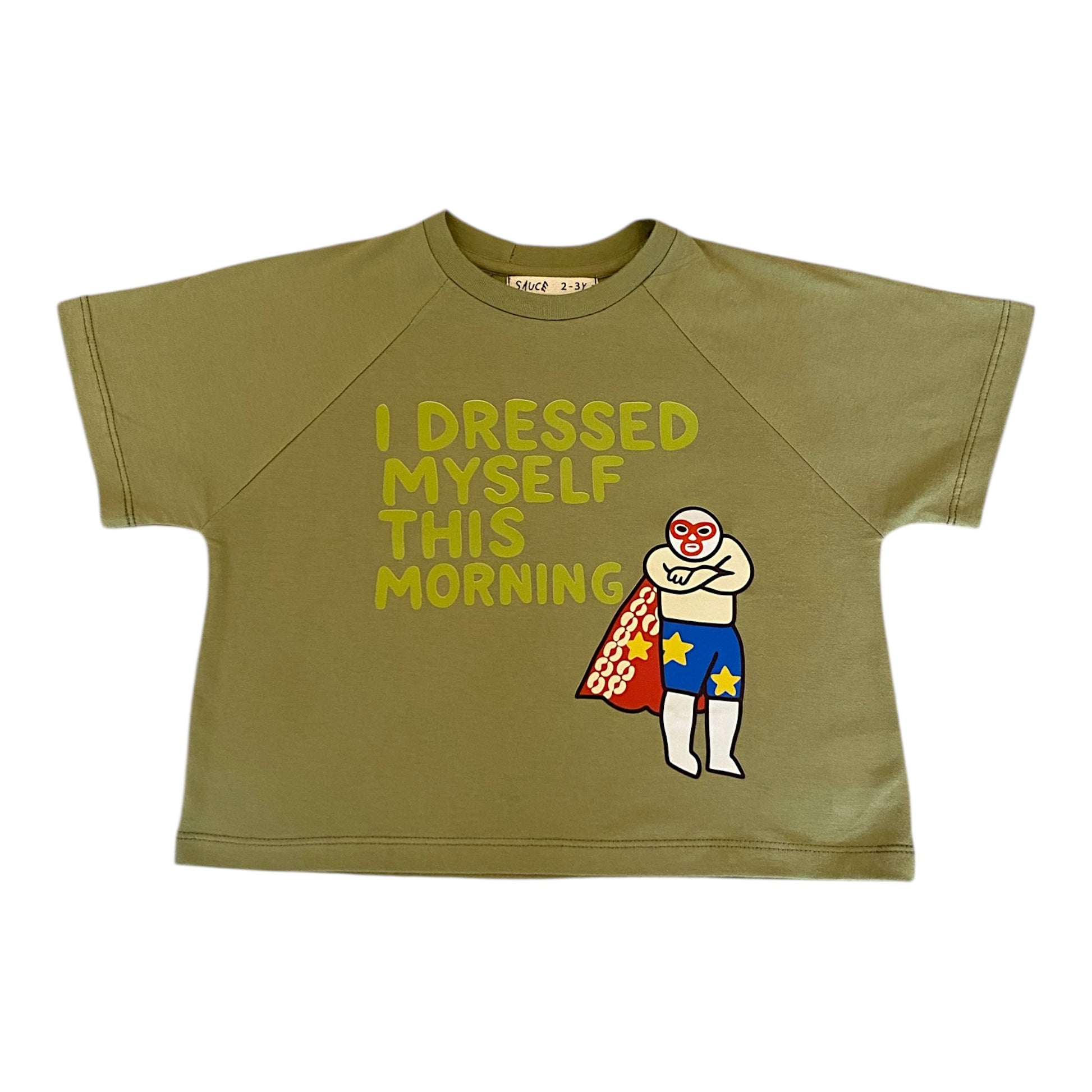 an oversized, boxy fit with a crewneck, a dropped shoulder. I dressed myself this morning graphic screen printed across the front.