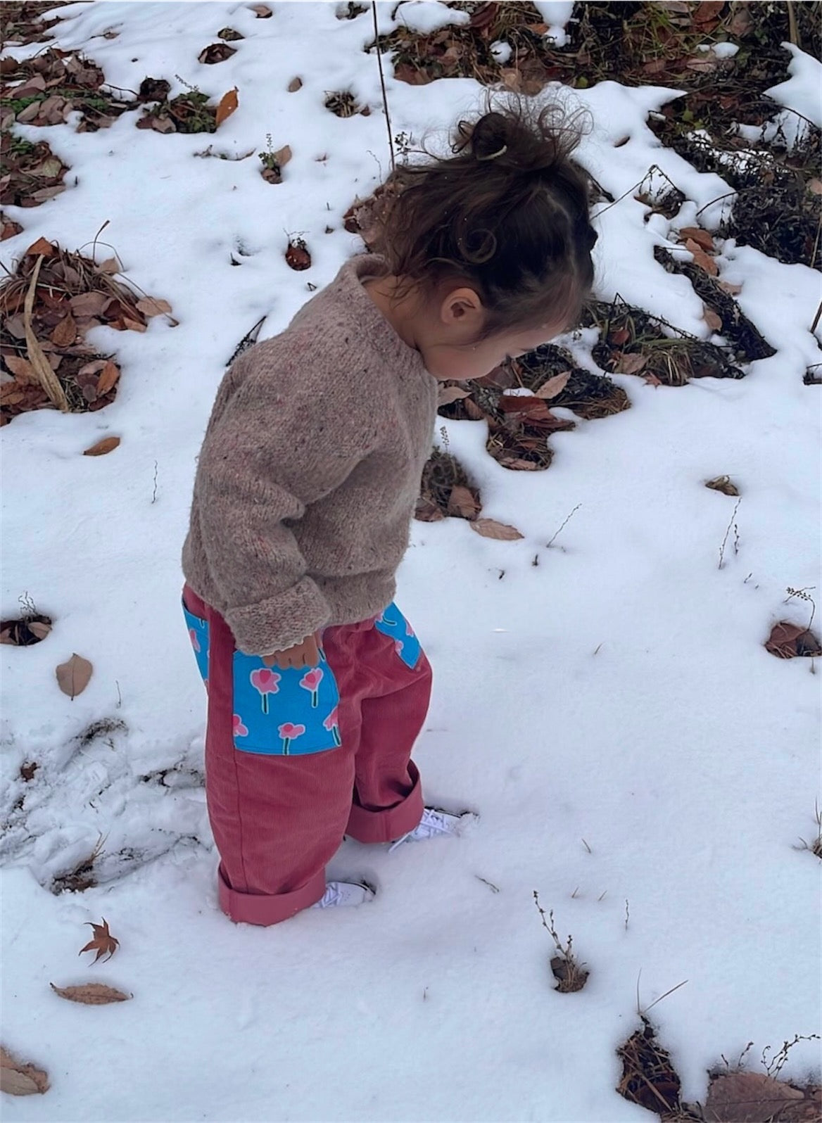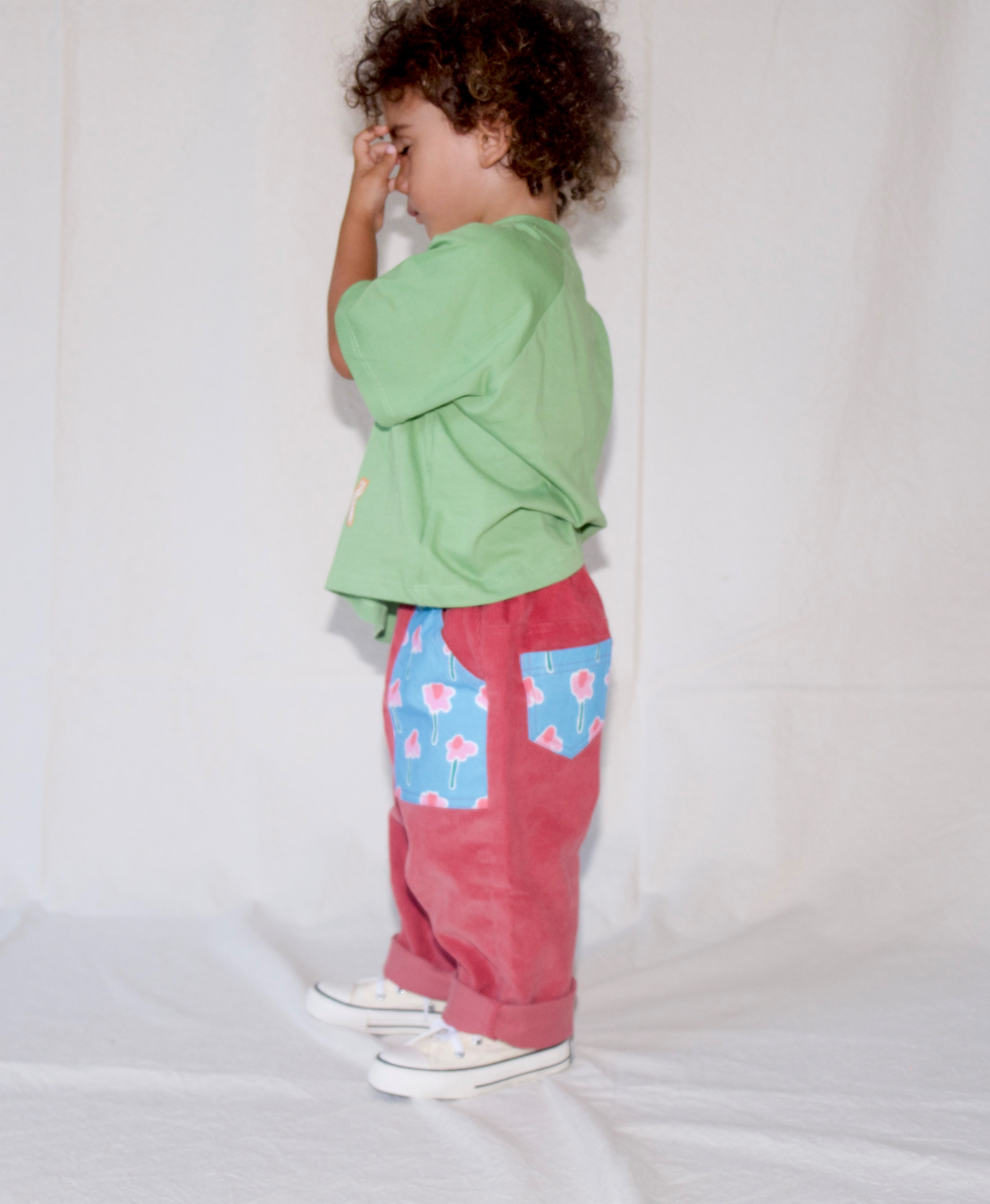 a baggy pull on pant in a soft cotton corduroy. Featuring a fully elasticated waist with custom printed canvas side and back pockets.